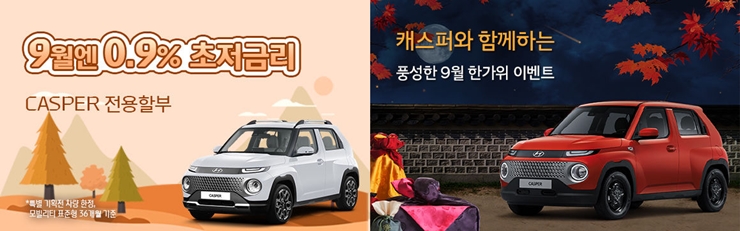 캐스퍼 9월 이벤트의 경우 저금리 할부와 추석 연휴 이벤트가 있습니다.